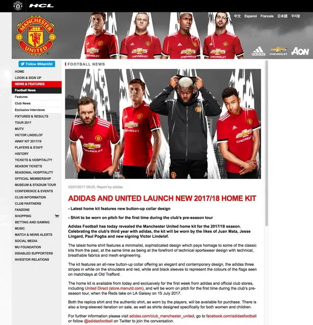 MU công bố áo thi đấu mới trên trang chủ CLB.