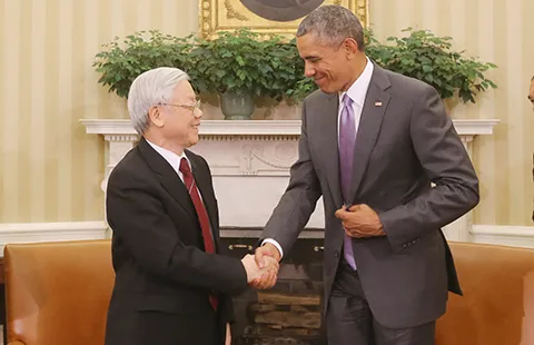 Tổng thống Mỹ Barack Obama hội đàm cùng Tổng Bí thư Nguyễn Phú Trọng trong chuyến thăm lịch sử năm 2015. Ảnh: TTXVN