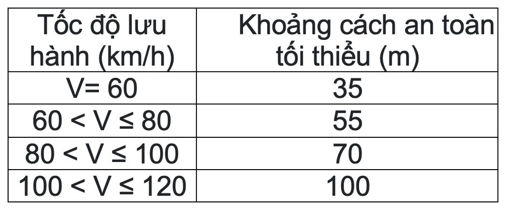 Trong điều kiện mặt đường khô ráo, khoảng cách an toàn ứng với mỗi tốc độ được quy định như sau: