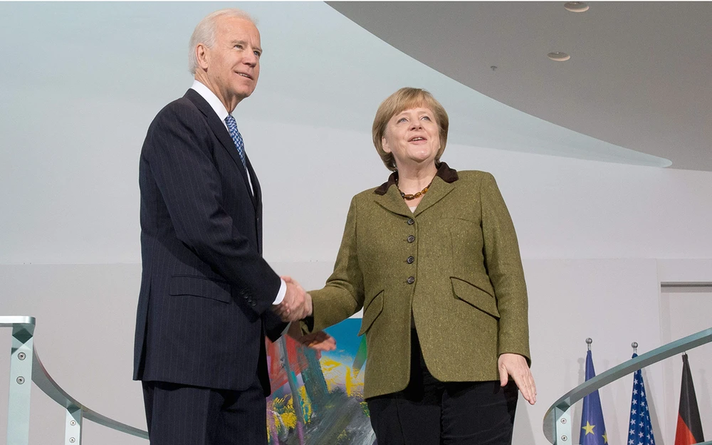 Thủ tướng Đức Angela Merkel (phải) tiếp đón Tổng thống Mỹ Joe Biden (trái)(khi đó còn là phó tổng thống) thăm chính thức thủ đô Berlin (Đức) hồi tháng