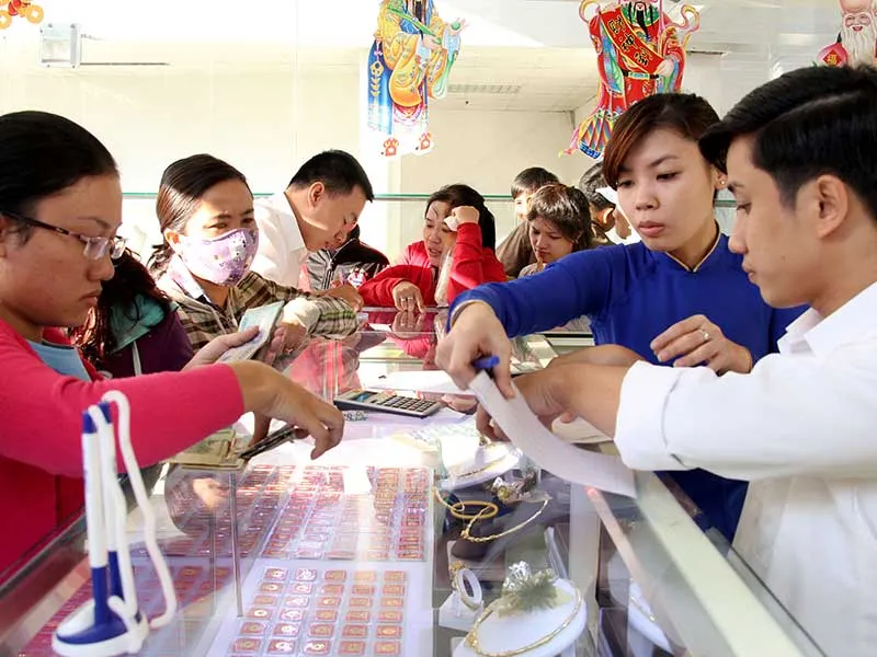 Các doanh nghiệp kinh doanh vàng gặp khó vì thiếu nguyên liệu để sản xuất.Trong ảnh: Khách hàng đang mua vàng tại cửa hàng vàng bạc đá quý SJC Minh Khai (TP.HCM). Ảnh: HOÀNG GIANG