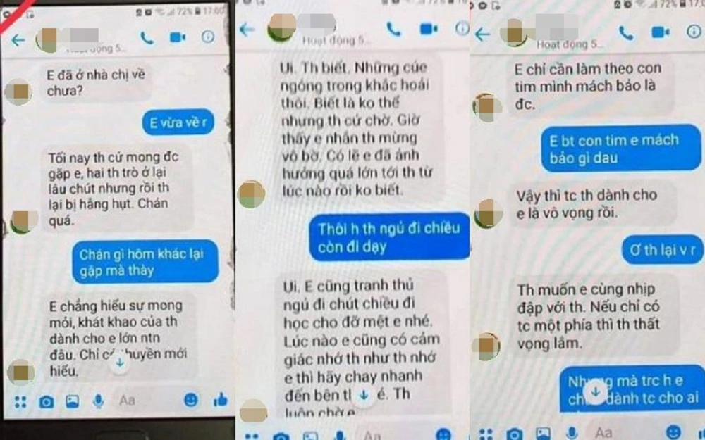 Trên đây là một số nội dung tin nhắn được cho là của thầy T (40 tuổi), đã có gia đình, giáo viên Địa lý trường THPT chuyên Nguyễn Du (Thái Bình) nhắn cho một nữ sinh lớp 10.