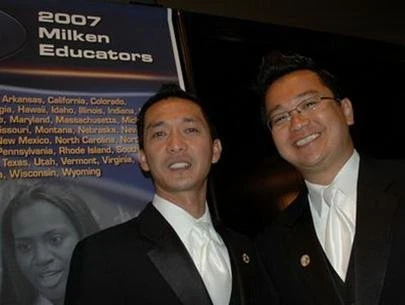 Thầy Aaron Chung (trái) và thầy John Nguyen tại buổi tiệc vinh danh ở Los Angeles. Ảnh: Quỹ Milken Family Foundation