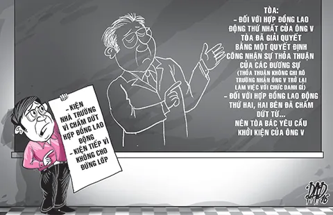 Đến năm học sau, ông V. nhiều lần yêu cầu trường cho ông làm công việc đúng chuyên môn giảng dạy nhưng không được chấp nhận. Đến tháng 10-2013 (sau nghỉ hè), ông V. nghỉ luôn, không vào trường làm việc nữa vì không đồng ý với việc bố trí công việc của trường. Tháng 11-2013, nhà trường đã ra quyết định chấm dứt hợp đồng lao động đối với ông V.