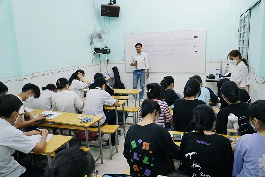 Lớp của thầy Khánh bắt đầu từ 17 giờ 30 đến 20 giờ 30, chia làm hai ca dạy, đều đặn từ thứ Hai đến thứ Bảy. Từ thời điểm giãn cách xã hội năm ngoái, cuộc sống bị đảo lộn khiến việc học tập của học sinh (HS) bị hạn chế, lúc đó thầy quyết định mở lớp dạy online môn toán cho các em, không thu đồng phí nào. Sau khi mọi thứ trở lại bình thường mới, thầy bắt đầu thuê mặt bằng mở bốn phòng học và giảng dạy miễn phí môn toán.