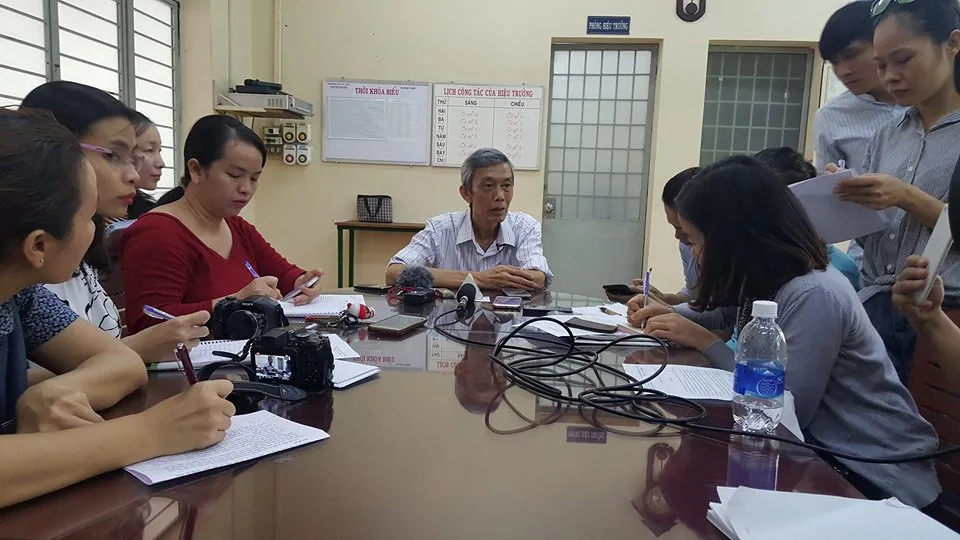 Thầy Hiệu trưởng Lê Trung Tín trong buổi gặp báo chí sáng 12-4.