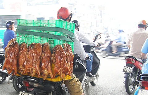 Vịt quay không che đậy chở ngoài đường dễ bám bụi bẩn. Ảnh: TRẦN NGỌC
