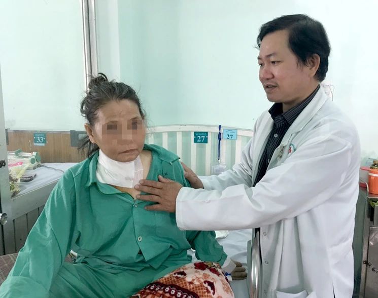Người nhà cho biết bà H. từng khám ở BV địa phương và phát hiện bị bướu tuyến giáp. Bác sĩ (BS) của BV này đề nghị phẫu thuật nhưng bà H. từ chối vì sợ đụng dao kéo. Bà H. tìm đến một thầy lang để bó thuốc Nam. Thế nhưng càng bó thuốc, khối bướu càng to và bị hoại tử.