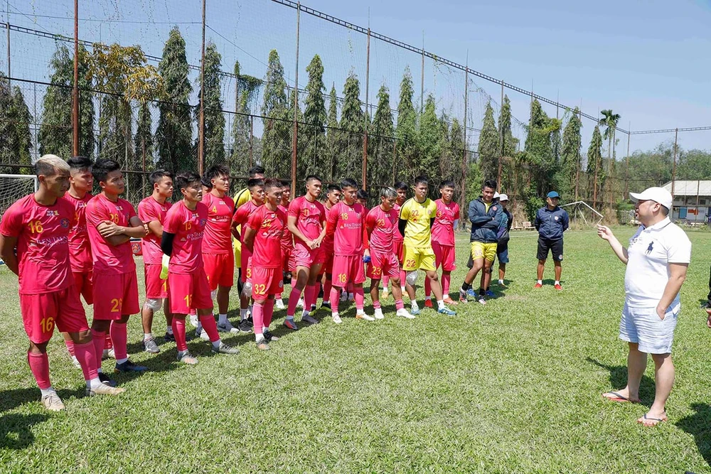 Ông bầu Trần Hòa Bình và các cầu thủ Sài Gòn FC trong buổi tập sau tết trên sân Thành Long mà không có HLV Vũ Tiến Thành. Ảnh: SGFC