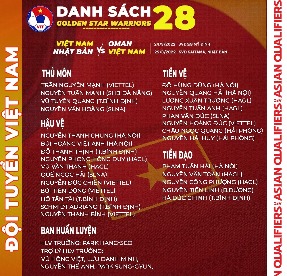 Tấn Trường và Tô Văn Vũ không may có kết quả xét nghiệm dương tính với COVID-19, trong khi Văn Vĩ chưa đạt phong độ cao nhất, còn trung vệ Đình Trọng bị chấn thương nên cũng lỡ hẹn ở đợt tập trung lần này. Theo VFF, thay thế cho bốn vị trí nói trên sẽ là thủ thành Nguyễn Văn Hoàng (SL Nghệ An), tiền vệ Châu Ngọc Quang (Hải Phòng), hậu vệ Đỗ Thanh Thịnh (Bình Định) và hậu vệ Nguyễn Thanh Bình (Viettel).