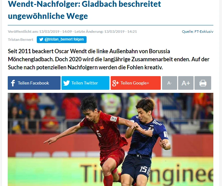 Fussballtranfer cũng khẳng định Văn Hậu chưa có tên tuổi ở châu Âu. Chân sút 19 tuổi người Thái Bình được đánh giá sẽ thay thế vị trí của Oscar Wendt sẽ hết hạn hợp đồng Monchengladbach vào năm sau.