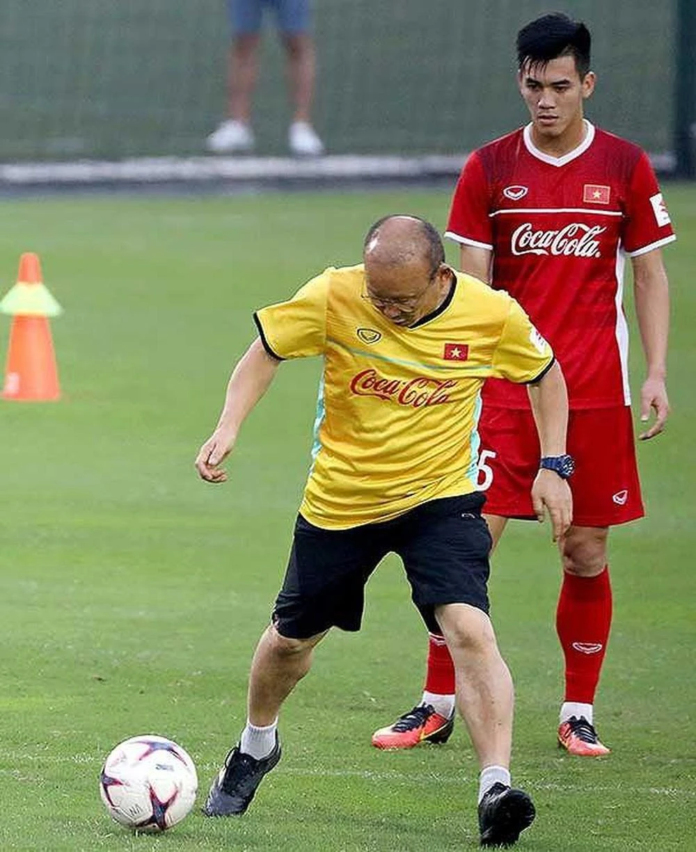 Park Hang-seo thị phạm động tác với bóng cho tiền đạo Tiến Linh. ẢNH: CTV