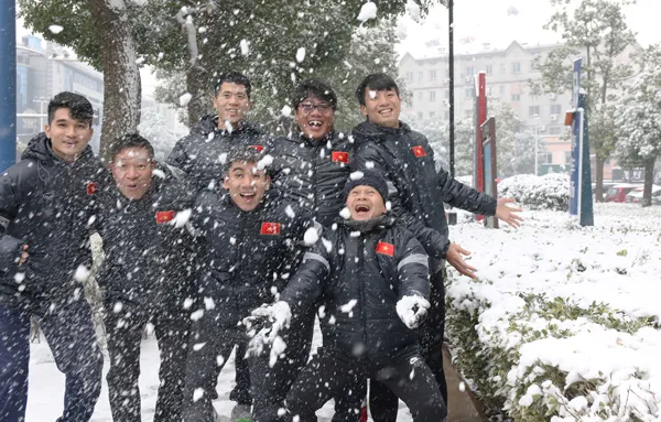 Các tuyển thủ U-23 Việt Nam buổi sáng 25-1 nghỉ tập đã tản bộ ra ngoài khuôn viên khách sạn nhằm thư giãn sau những trận đấu căng thẳng. So với ngày hôm qua, tuyết rơi dày đặc hơn và biến khung cảnh tại Thường Châu thành một màu trắng xóa.