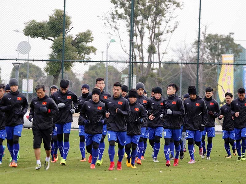Thầy trò HLV Park Hang-seo với buổi tập đầu dưới cái rét trên đất Trung Quốc. Ảnh: VFF