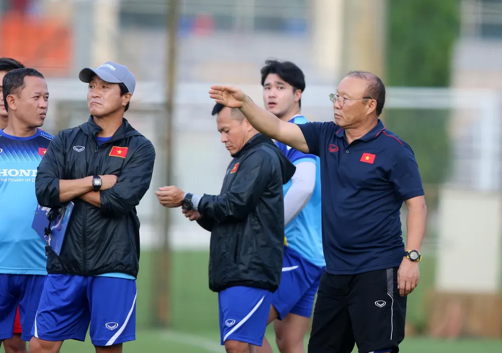 HLV Park Hang-seo và các cộng sự tập trung tối đa trong các buổi tập luyện cho đội tuyển Việt Nam. Ảnh: NGỌC DUNG