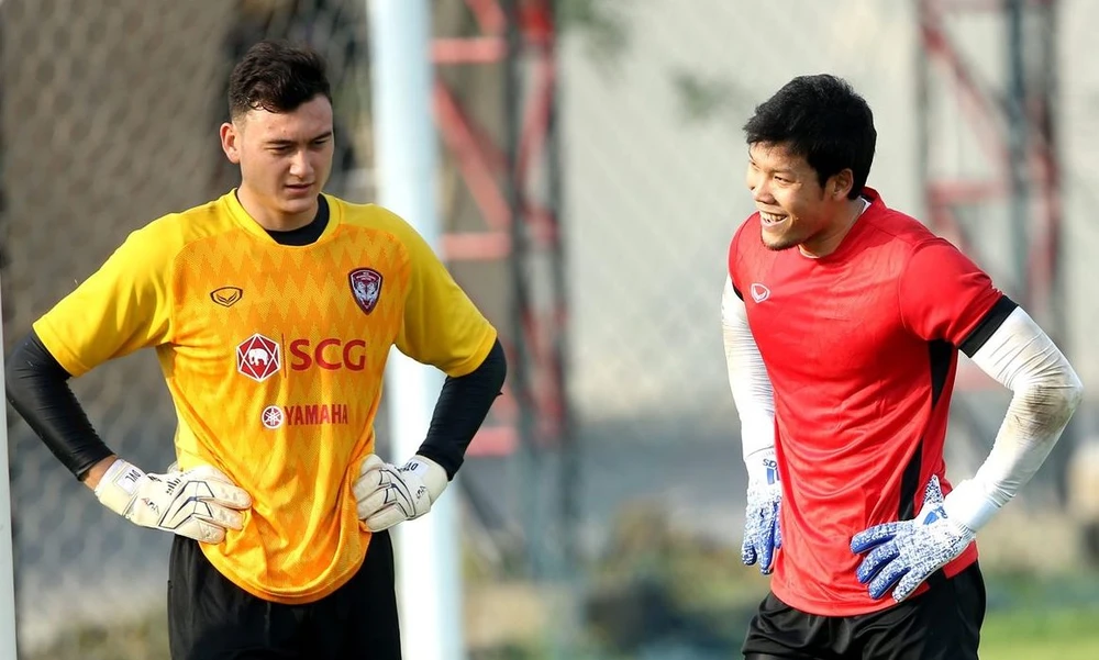 Thủ môn đội tuyển Thái Lan (phải) Kawin cùng chung cảnh ngộ với Công Phượng ở Bỉ. Ảnh: CMQ