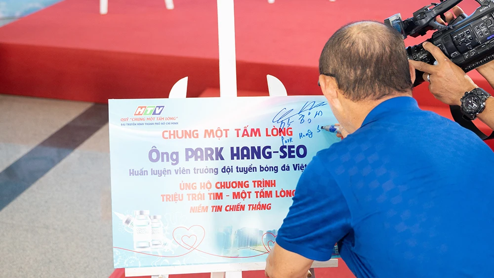 HLV Park Hang-seo ký vào bản danh vị của Quỹ. Ảnh: HTV