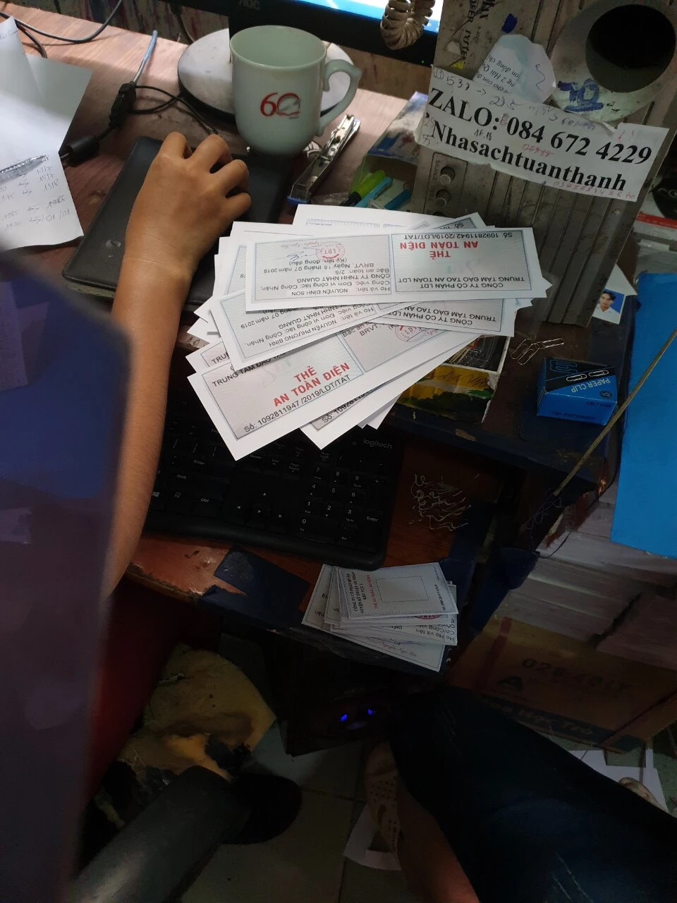 Tại tiệm photocopy nêu trên, Công an phường 10 ghi nhận một thanh niên tên H. cùng chủ tiệm đang in sao 19 thẻ chứng nhận an toàn điện được cấp bởi bên đào tạo là Công ty LDT, sáu thẻ an toàn vệ sinh lao động, nhóm 2 của Công ty CP Huấn luyện Kỹ thuật an toàn Khu vực 2.