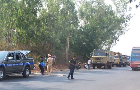 Một tài xế xe tải có xe nằm ì bên đường cho biết họ đã đứng chờ tại đây từ tối 1-4 nhưng công an… chưa chịu đi nên họ không dám chạy! Vì là địa bàn giáp ranh giữa hai tỉnh nên công an không thể mang cân qua Gia Lai để buộc xe tải “giẫm qua”, còn tài xế thì chưa vào địa bàn Kon Tum nên công an cũng không buộc cân xe được, thế là hai bên cứ “trừng nhau” không biết đến bao giờ!