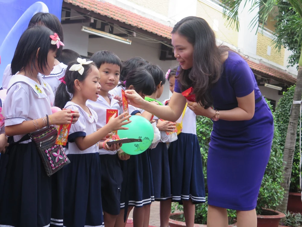 Cô hiệu trưởng Trần Thúy An trao những phần quà lì xì cho các em nhỏ có hoàn cảnh khó khăn