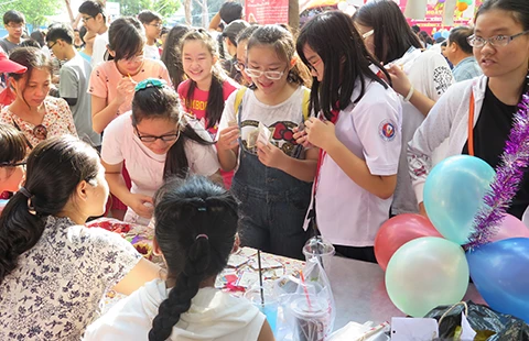HS Trường THCS Trần Văn Ơn đang chọn mua các món đồ do chính giáo viên và HS làm ra để gây quỹ.