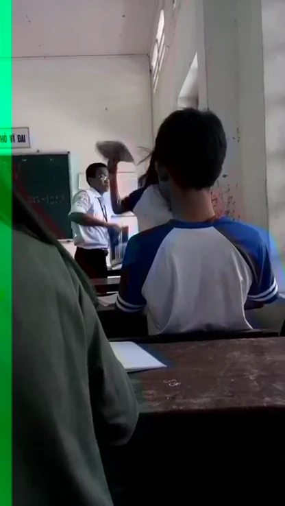 Khi người giáo viên bỏ đi, nữ sinh này còn dùng một quyển sách chọi theo, sau đó thì cầm cây viết trên tay với tư thế “đe dọa” những ai đến gần.