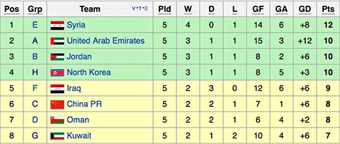 Thế nhưng cơ hội của tuyển Việt Nam là rất nhỏ, vì sau khi kết thúc vòng bảng chỉ có 10 điểm (nếu thắng Iraq), trong lúc các đối thủ ở bảng khác có nhiều thuận lợi hơn. Ngoài Syria có 12 điểm, nhìn vào các đội nhì ở bảng khác như UAE, Jordan, CHDCND Triều Tiên đều có 10 điểm nhưng vẫn còn một trận chưa đấu. Hai đội nhì bảng khác là Trung Quốc và Oman cùng chơi năm trận, có 8 điểm vẫn trội hơn 1 điểm so với tuyển Việt Nam. Riêng tuyển Kuwait đang có 7 điểm với hiệu số cao hơn thầy trò Hữu Thắng sáu bàn thắng (xem bảng điểm số các đội nhì bảng).
