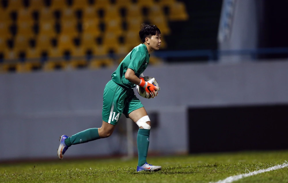 Thủ môn Kim Thanh đến từ TP.HCM có một trận đấu xuất thần dù còn bị chấn thương tay, trong đó một lần phá hỏng quả 11 m của đối phương. Ảnh: NGỌC DUNG