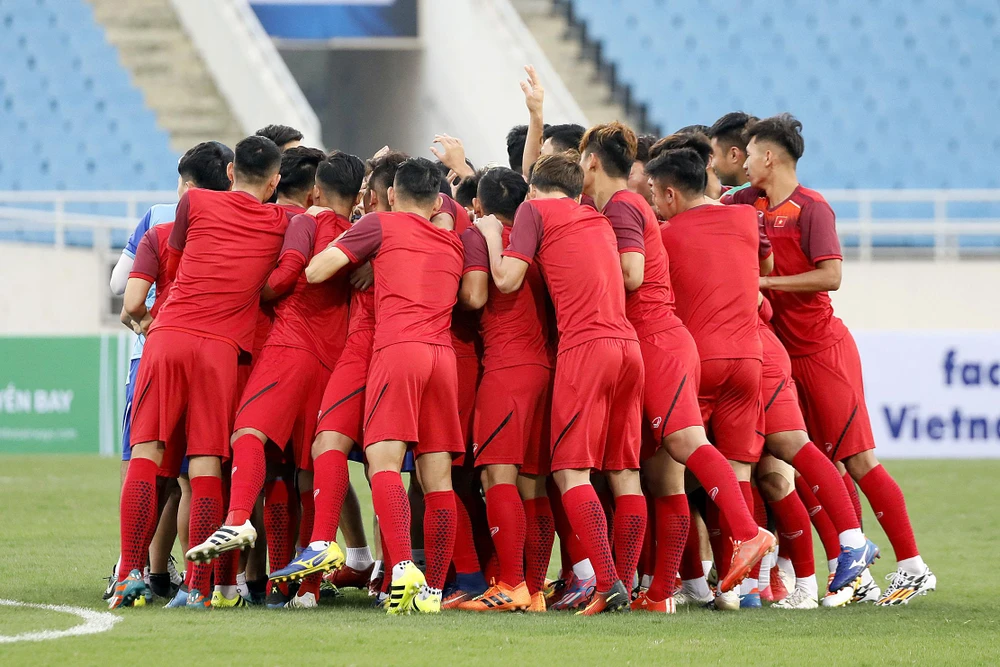 Các tuyển thủ trẻ U-23 siết tay nhau quyết tâm có những trận đấu vòng loại U-23 châu Á tốt nhất. Ảnh: NGỌC DUNG