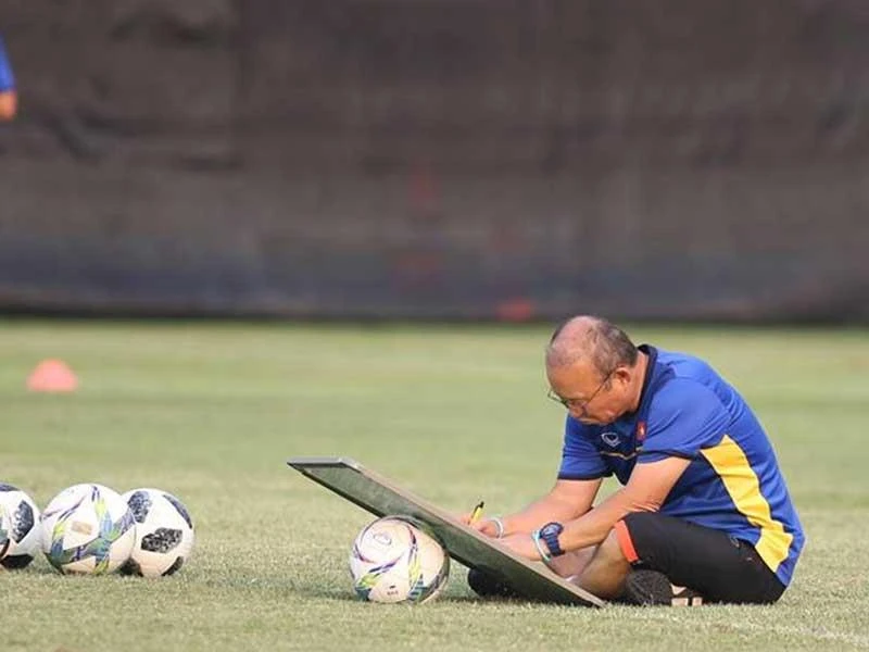 HLV Park Hang-seo nghiền ngẫm phân tích lối chơi của đối thủ và lên đấu pháp cho học trò. Ảnh: NGỌC DUNG