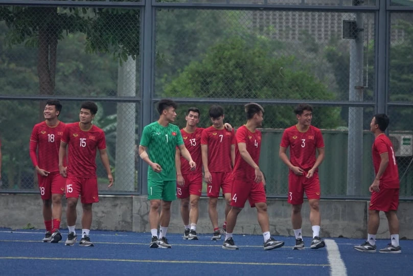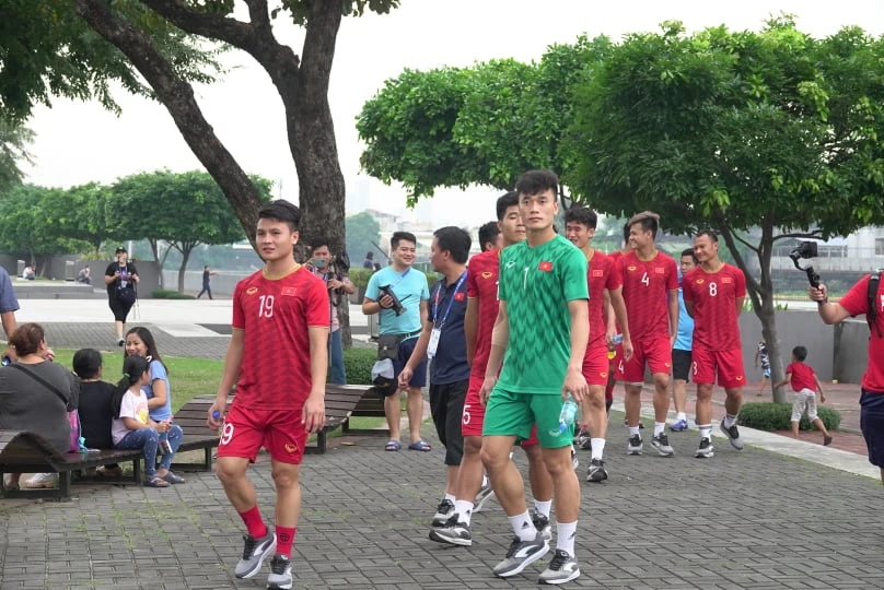 Các tuyển thủ U-22 Việt Nam vui vẻ trên đường ra sân tập Blue Pitch.