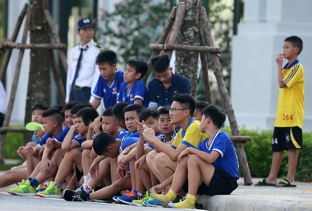 Các cầu thủ nhí của Trung tâm PVF hào hứng xem những đàn anh tập luyện.