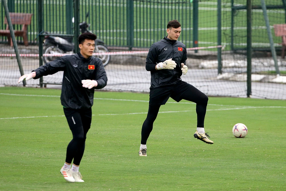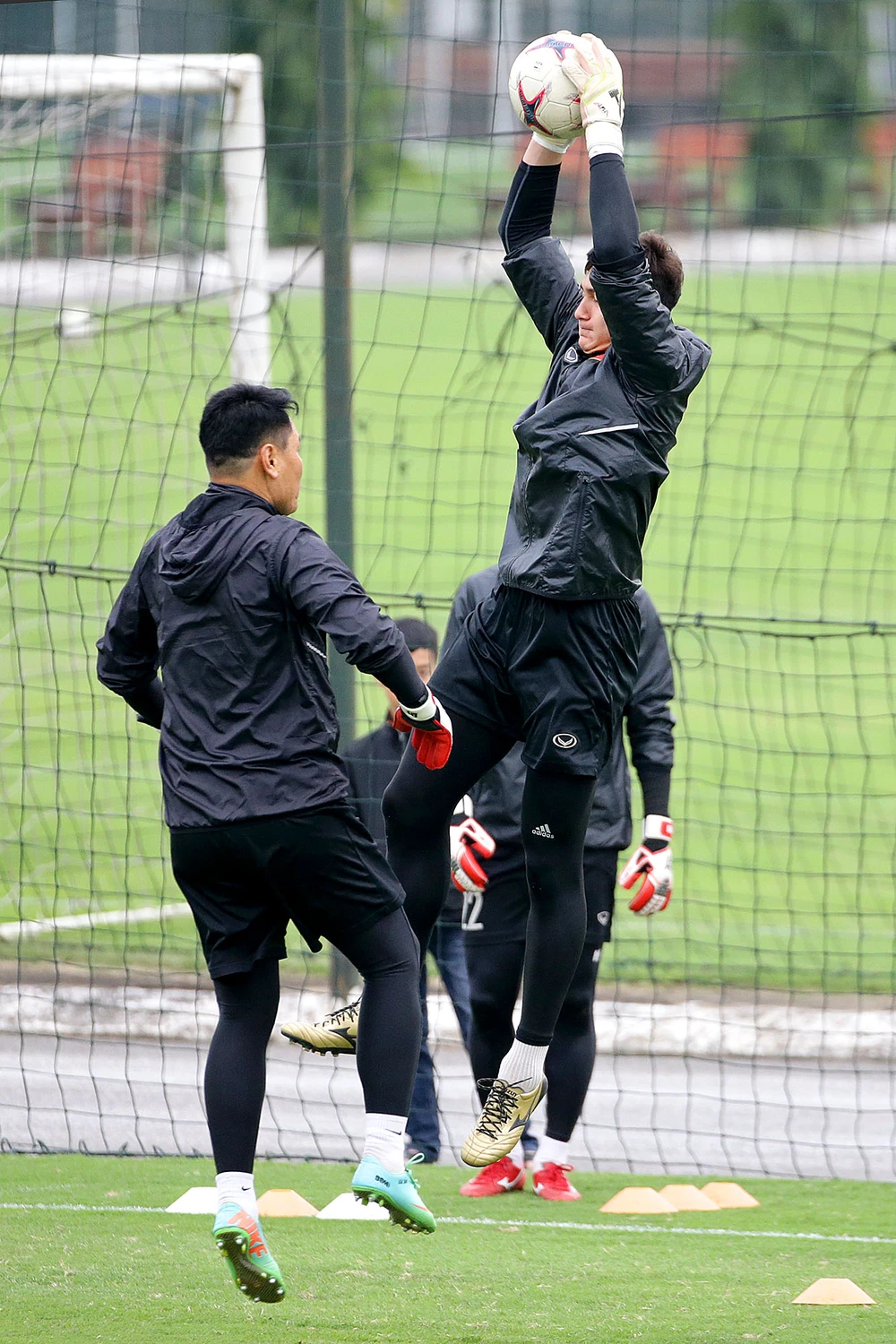 Thủ môn trẻ Bùi Tiến Dũng (trái) chưa có một phút ra sân ở AFF Cup 2018 vẫn luôn tích cực tập luyện và học hỏi đàn anh Văn Lâm.