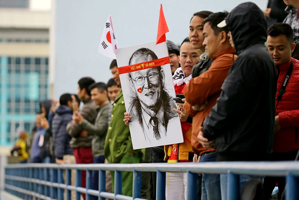 Có đông đảo người hâm mộ đội tuyển Việt Nam đến xem thầy trò Park Hang-seo tập luyện và còn thân thiện mang theo cả bức chân dung khổ lớn của ông thầy người Hàn Quốc.