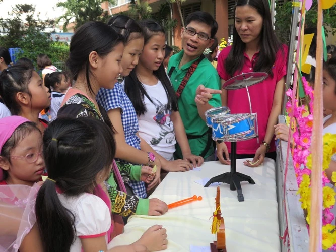 Các em Trường Tiểu học Nguyễn Bỉnh Khiêm bên dàn nhạc mini thầy trò tự làm trong ngày hội Xuân yêu thương