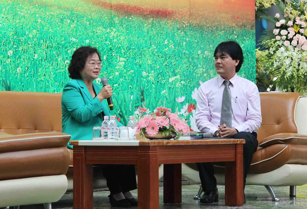 Nguyên Phó Chủ tịch nước Trương Mỹ Hoa và Hiệu trưởng THPT Nguyễn Du Huỳnh Thanh Phú cùng giao lưu với các em học sinh.