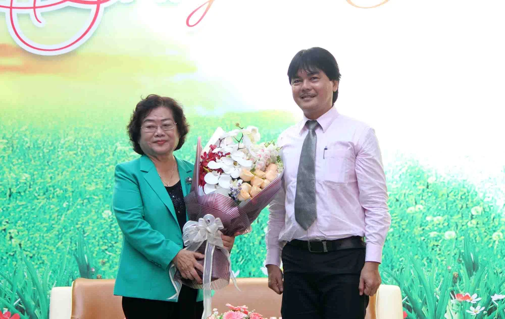 Đại diện nhà trường tặng hoa cảm ơn nguyên Phó Chủ tịch nước Trương Mỹ Hoa.