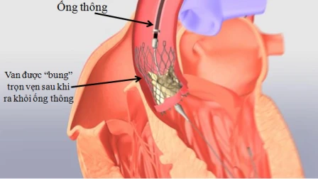 Van tim nhân tạo được đưa vào vị trí van động mạch chủ bị hẹp.