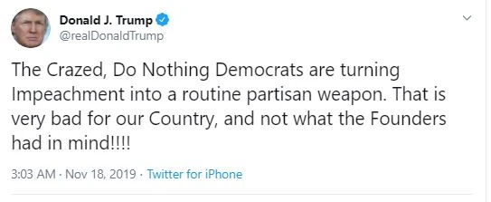 Đáp lại, Tổng thống Trump tiếp tục đăng trên Twitter của mình rằng: "Đảng Dân chủ mất kiểm soát, chẳng làm gì cả, đang biến điều tra luận tội thành vũ khí đảng phái. Điều này không tốt cho đất nước, không phải là điều mà những nhà sáng lập đất nước này mong muốn".