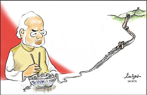 Ấn Độ lo ngại chính sách xâm lấn của Trung Quốc. Biếm họa đăng trên báo Japan times (Nhật)