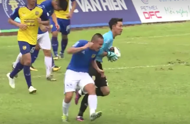 Đặng Văn Phi Pha bị thủ môn Hiếu Nhơn chơi xấu.