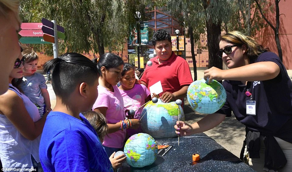 Một số em bé được giải thích về hiện tượng nhật thực sắp xảy ra. Ảnh: AFP