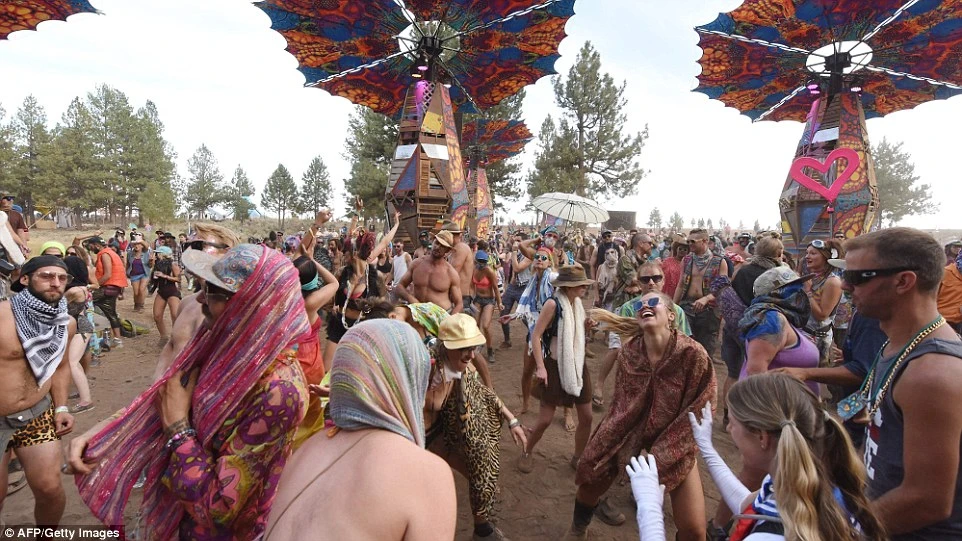 Mọi người nhảy múa tại lễ hội Oregon Eclipse Burning Man. Ảnh: AFP