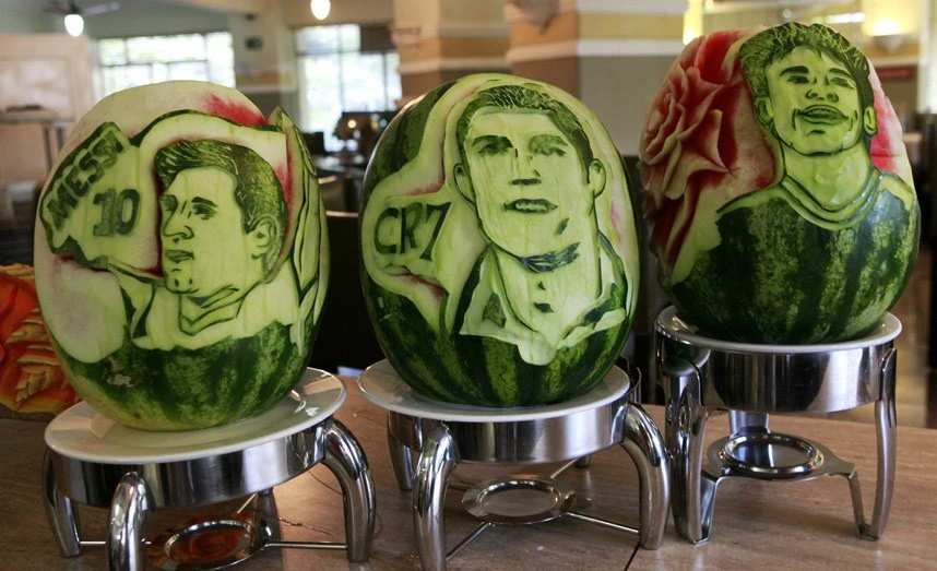 Dưa hấu với hình khắc các thần tượng bóng đá gồm Lionel Messi (Ác-hen-ti-na), Cristiano Ronaldo, và Neymar (Brazil) ở thành phố Sao Paulo, Brazil
