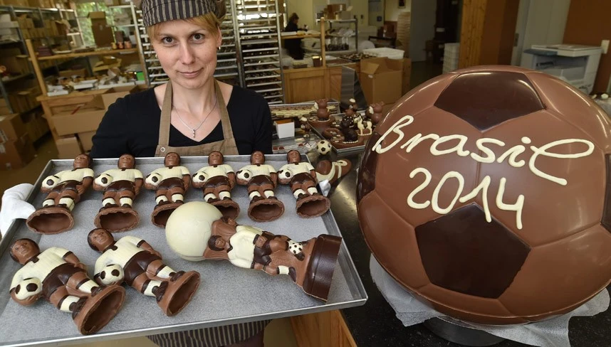 Các cầu thủ bóng đá bằng sôcôla tại tiệm Confiserie Felicitas ở Hornow, Đức.