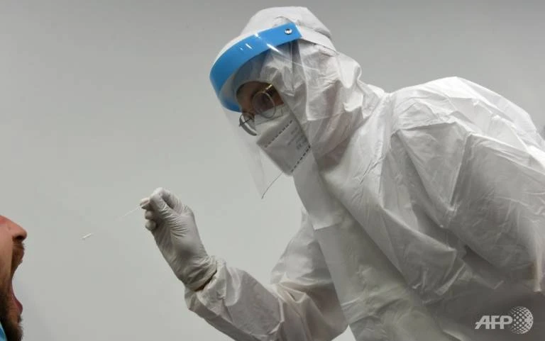 Một nhân viên y tế lấy mẩu xét nghiệm tại trung tâm xét nghiệm COVID-19 ở sân bay Munich. Ảnh: AFP