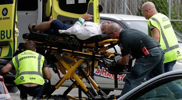 Nhân viên cứu thương đưa nạn nhân vụ xả súng ra khỏi nhà thờ ở TP Christchurch, New Zealand. Ảnh: AP
