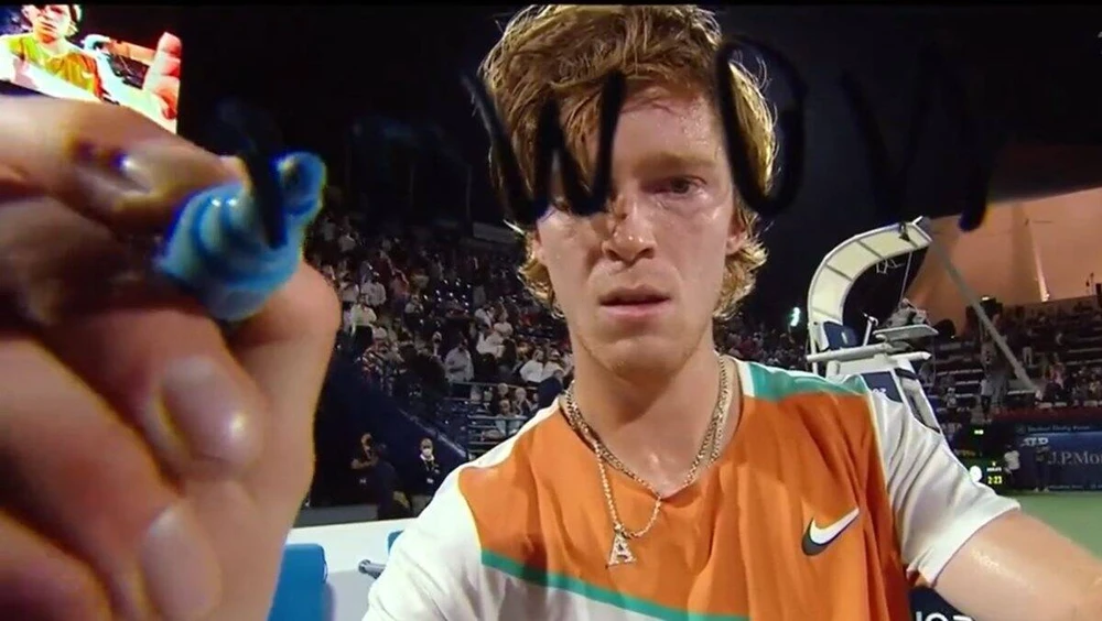 Tay vợt Rublev của Nga đang dự giải ở Dubai viết lên ống kính truyền hình “Stop War Please” (Hãy dừng chiến tranh).