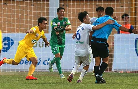 Trận nào cầu thủ trẻ của HA Gia Lai cũng nỗ lực chơi cống hiến nhưng có nhiều lần thua bởi sự khắt khe của trọng tài (ảnh dưới). Ảnh: QUANG THẮNG