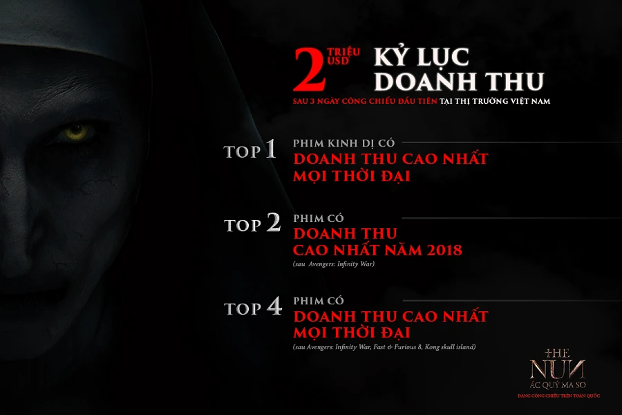 Ở thị trường quốc tế, The Nun còn được đón nhận nồng nhiệt hơn. Tác phẩm mang về 77,5 triệu USD, nâng tổng doanh thu toàn cầu của phim tới thời điểm hiện tại lên đến 131 triệu USD. Ở Việt Nam, phim tạo nên cơn sốt phòng vé với 2 triệu USD trong 3 ngày cuối tuần đầu tiên công chiếu và phá vỡ hàng loạt kỷ lục phòng vé chưa từng có cho bộ phim thể loại phim kinh dị tại đất nước hình chữ S: phim kinh dị có doanh thu mở màn cao nhất mọi thời đại, phim có doanh thu cao thứ 2 trong năm 2018 (tính đến thời điểm hiện tại, chỉ sau Avengers: Infinity War) và là phim có doanh thu cao thứ 4 mọi thời đại ở Việt Nam (sau Avengers: Infinity War, Fast and Furious 8 và Kong: Skull Island).